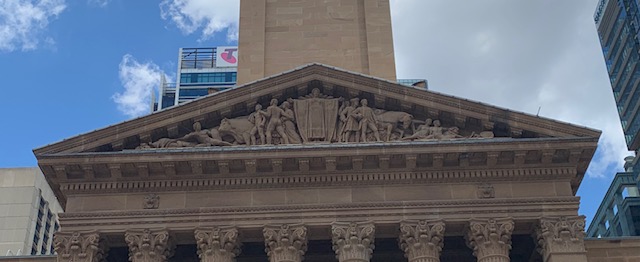 We were then taken outside to view the stone carving that sits above the entrance. Known as the “tympanum”, it was carved by sculptor Daphne Mayo and is meant to depict the settlement of Queensland. So presumably someone wearing a toga held up their hands and lo! men clad in breeches and three-corner hats, and other naked men, brought horses, cows, guns and exotic plants and quite literally drove the original inhabitants onto the ground before them. To the left of the edifice, two Aboriginal men are seen lying on the ground, one under a shield, the other still clutching his shield and spear. A kangaroo and a koala are squished into the remaining space in the corner, looking distinctly uncomfortable. It’s really a pretty distressing scene. Our guide acknowledged that this was now seen as a regrettable depiction.